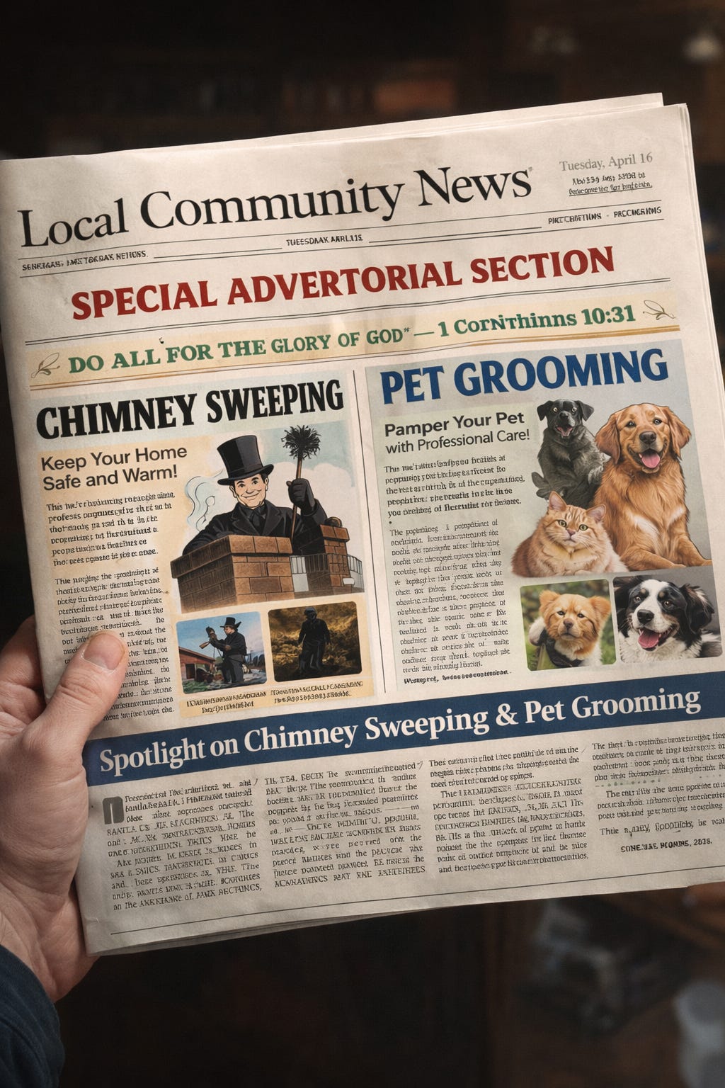 Back in the day, the occasional Easter section (or other holiday sections) had some original content, feature stories about a local pageant or tradition, and so forth. Readers of the last CNI Easter product got much less. But, as in days of old, the ads sold quickly and this time the pages were filled with cut and paste Bible verses.